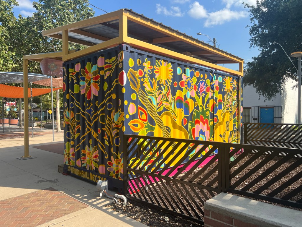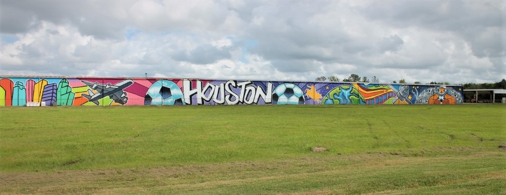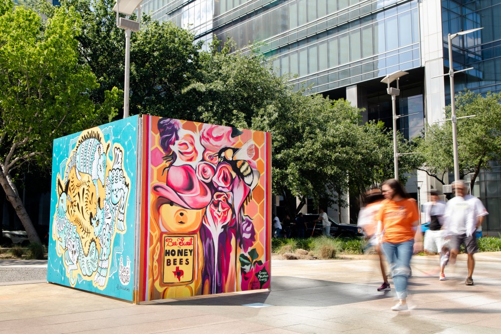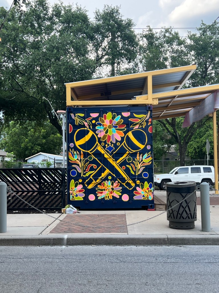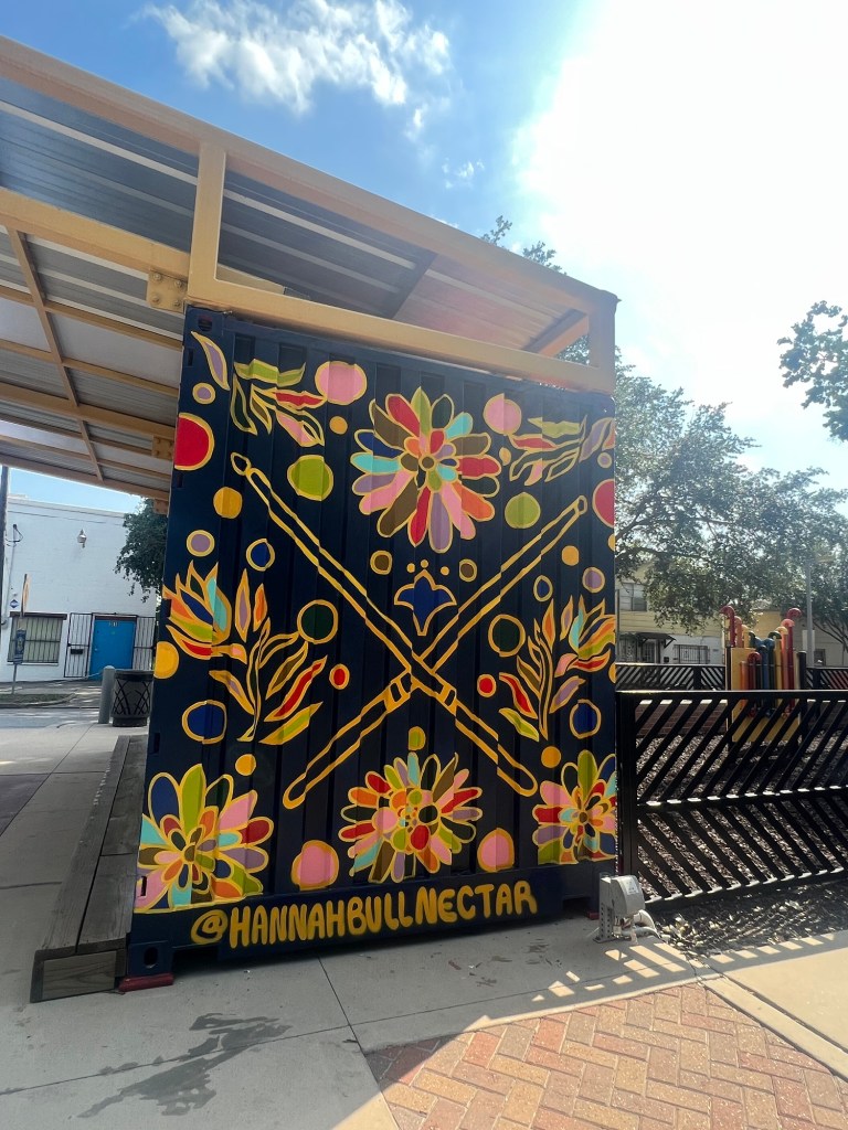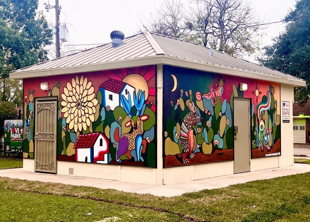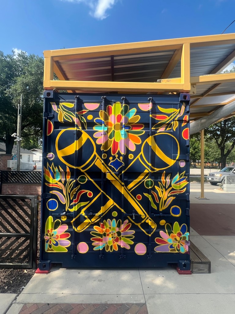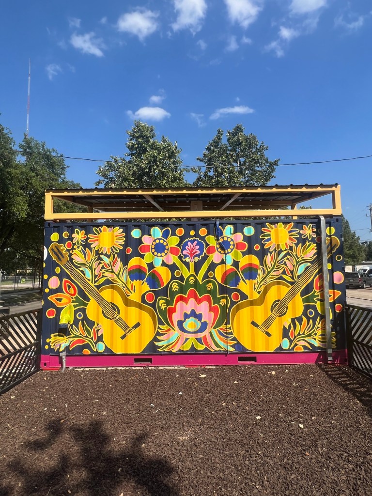 Irvington Park Project for Mayor Turner’s ‘Love Our Parks’ Initiative. Consisted of two murals, four basketball columns and a 200 foot concrete playground perimeter. 2022‘Please don’t eat the moon.’ 8 x 20 foot Mural for Garland, TX Art AlleyArt Car Van for the City of Garland Theater and Arts DistrictMusic Box Murals for East End Hou located along the Esplanade in EaDoJumpsuits painted for ‘Uncle Jumbo’ who was a Grammy nominee for ‘Best Children’s Album.’ Pump N’ Crunch Mural for local small health food catering business “Bee Sweet, Y’all’ – Earth Day murals at Discovery Green 8′ x 8′ feet, latex on wood“Bee Sweet, Y’all” – Earth Day murals at Discovery Green 8′ x 8′ feet, latex on wood“Bee Sweet, Y’all” – Earth Day murals at Discovery Green190 x 11 foot mural for Greentown Labs