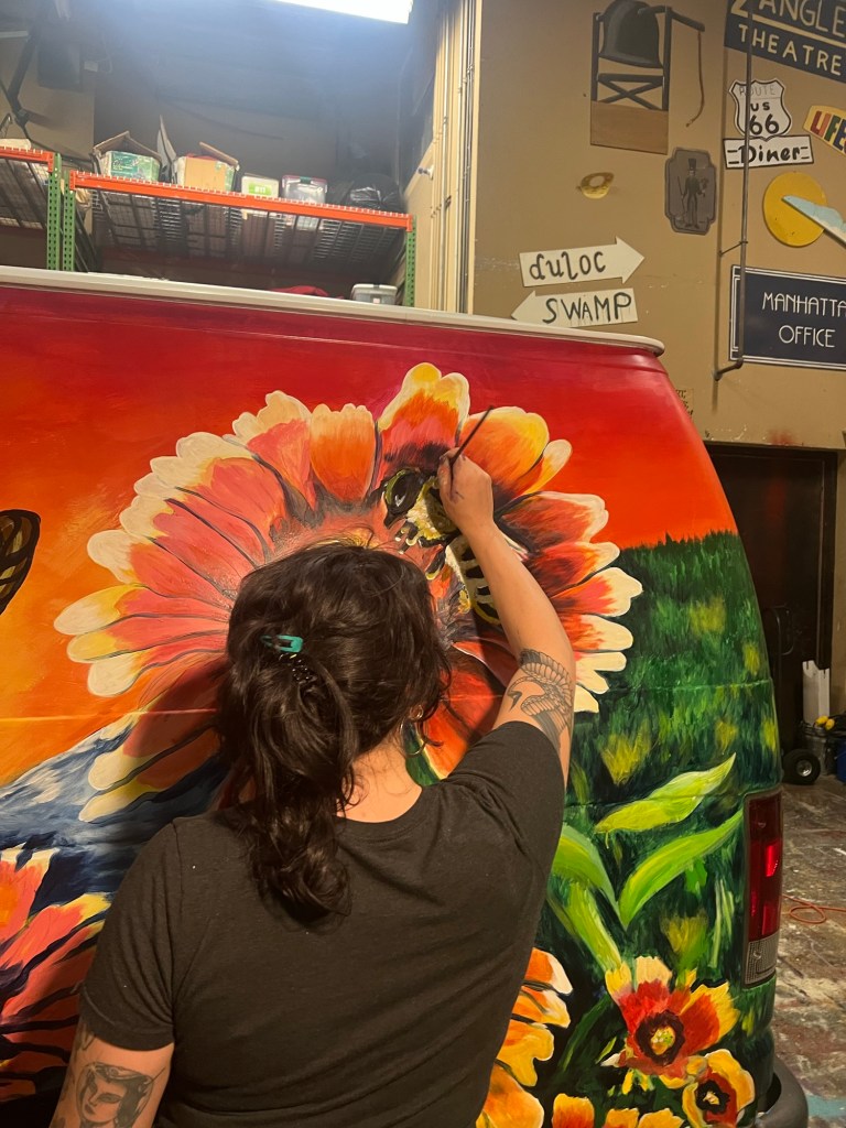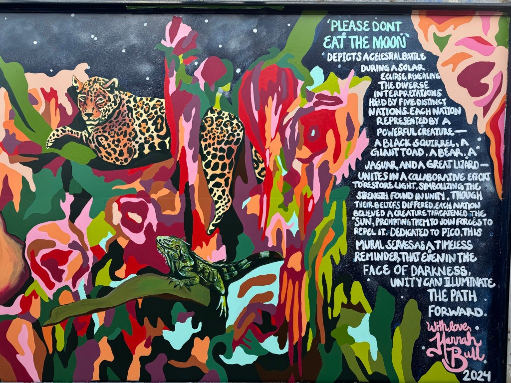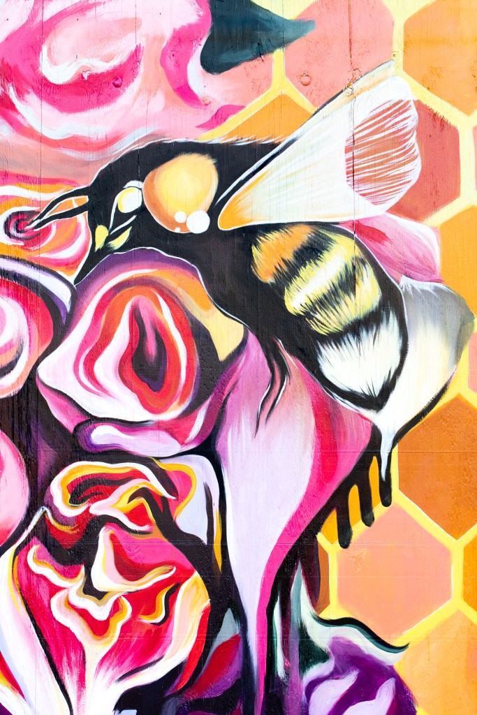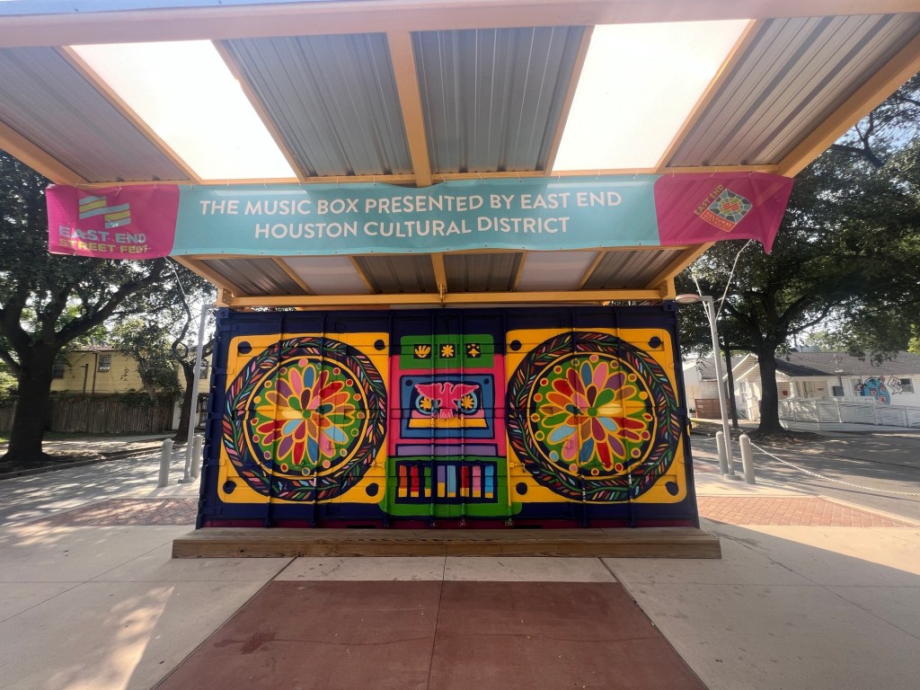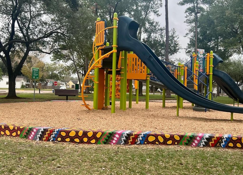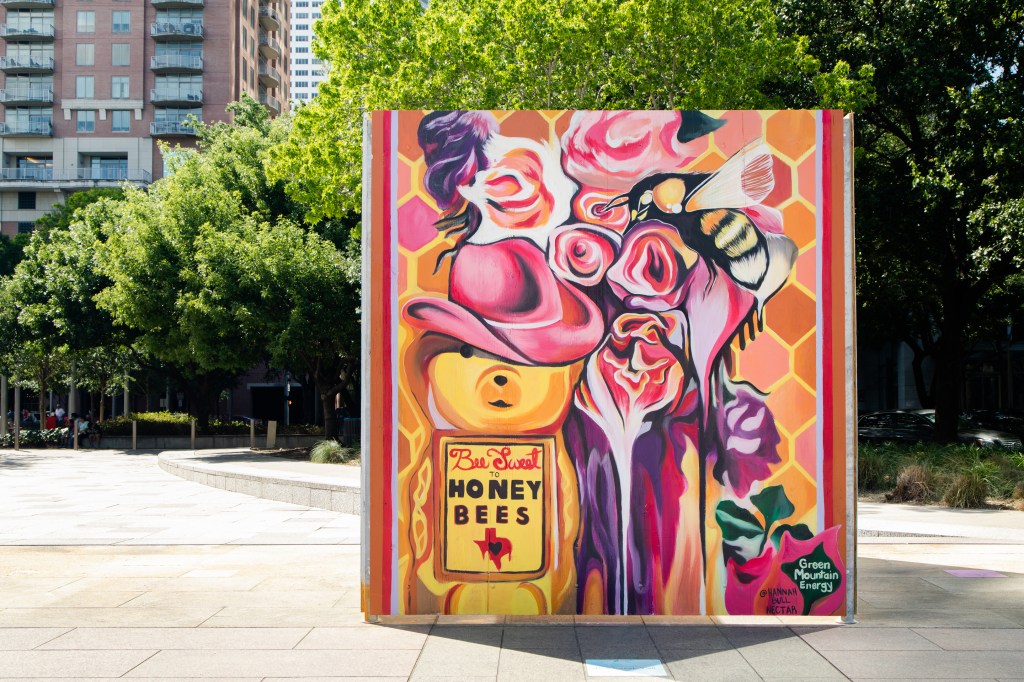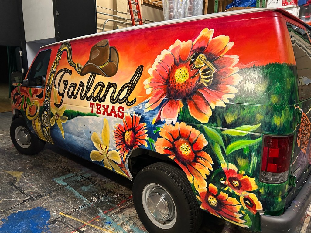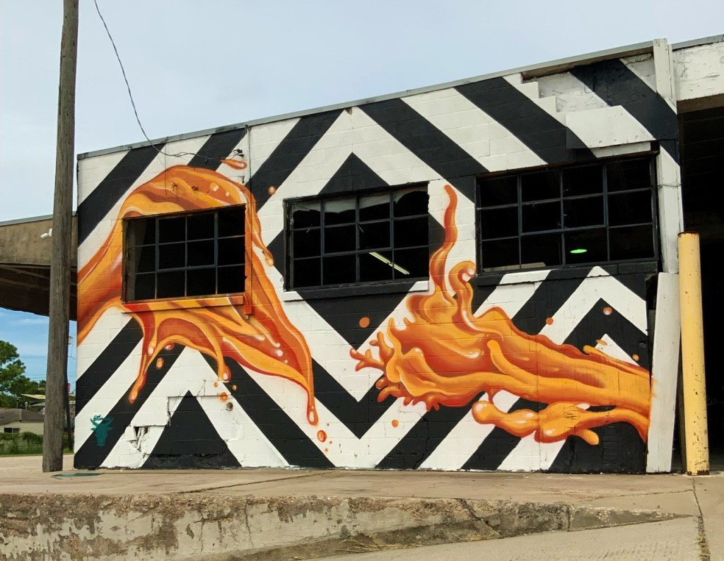Irvington Park Project for Mayor Turner’s ‘Love Our Parks’ Initiative. Consisted of two murals, four basketball columns and a 200 foot concrete playground perimeter. 2022‘Please don’t eat the moon.’ 8 x 20 foot Mural for Garland, TX Art AlleyArt Car Van for the City of Garland Theater and Arts DistrictMusic Box Murals for East End Hou located along the Esplanade in EaDoJumpsuits painted for ‘Uncle Jumbo’ who was a Grammy nominee for ‘Best Children’s Album.’ Pump N’ Crunch Mural for local small health food catering business “Bee Sweet, Y’all’ – Earth Day murals at Discovery Green 8′ x 8′ feet, latex on wood“Bee Sweet, Y’all” – Earth Day murals at Discovery Green 8′ x 8′ feet, latex on wood“Bee Sweet, Y’all” – Earth Day murals at Discovery Green190 x 11 foot mural for Greentown Labs